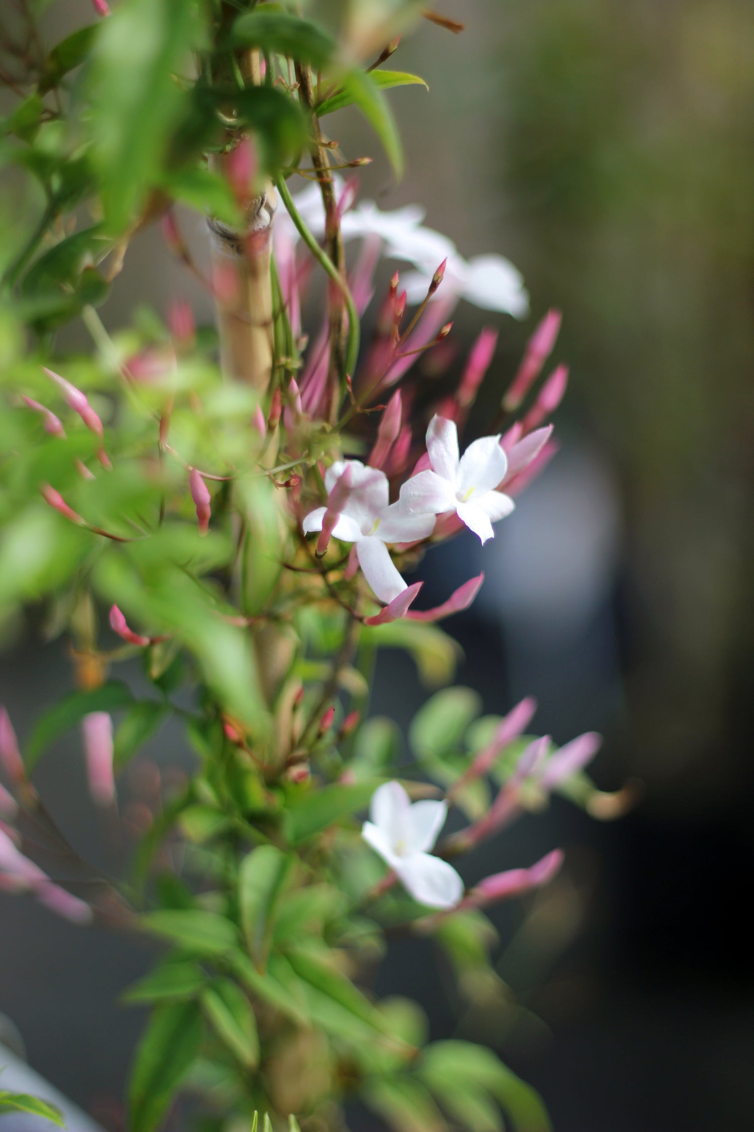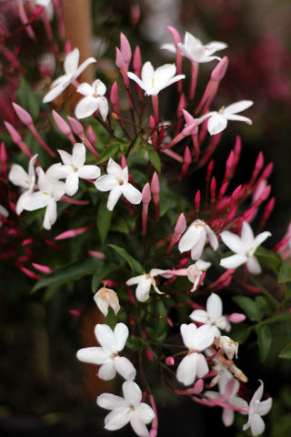 El Jazmín de Hungría (Jasminum polyanthum) es una trepadora de hojas persistentes (ya que no sufrimos de fríos extremos) y que produce flores blancas por dentro y con un tinte rojizo muy marcado en la parte exterior. Son muy perfumadas y se agrupan en racimos terminales multifloras.